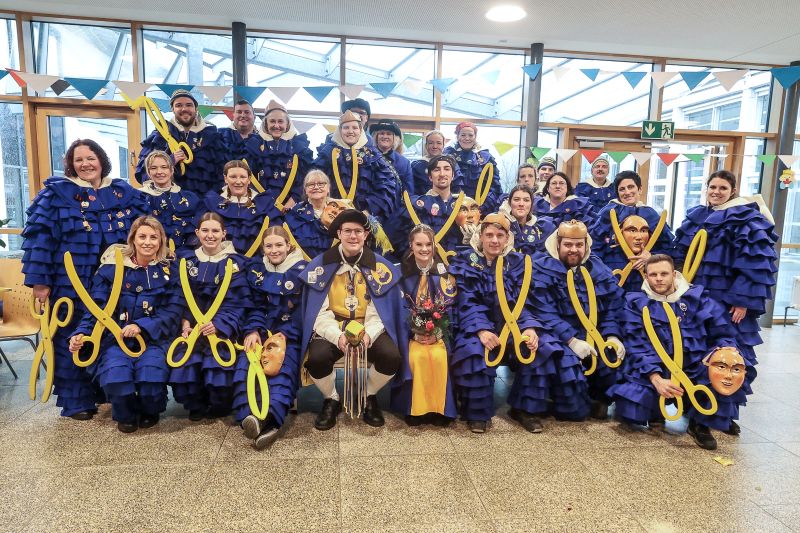Der traditionelle Schmutzige war in diesem Jahr facettenreich wie selten zuvor. Am Vormittag zog es das Baronspaar mit vielen Schergässlern in die beiden Kindergärten im Ort und die Grundschule. Die Schulkinder freuten sich, dass der Unterricht abrupt zu Ende war und stimmten sich gemeinsam mit den Schergässlern närrisch auf den weiteren Tag ein. Dabei entstand auch ein Foto der "Schergässler-Klasse" ohne Lehrkraft. Ohne Lehre tauchten parallel zwei närrische Urgesteine im "Ideenreich" auf und machten sich an die Arbeit. Närrische Sträuße wurden von Dominik und Hannes gebunden - unter anderem auch ein frischer Strauß für Baronin Laura. Diesen präsentierte sie stolz der Narrenschar auf dem Lindenplatz, die den Baumstellern applaudierte als der Narrenbaum routiniert errichtet wurde.